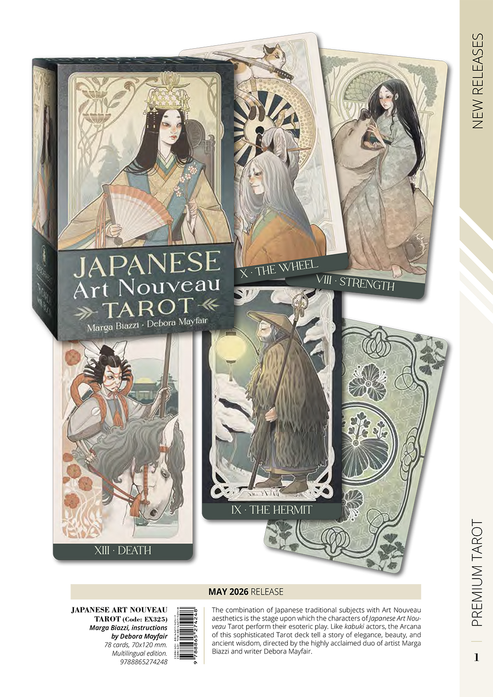 巧妙融合日本傳統題材與新藝術(Art Nouveau)美學,呈現出一場充滿神祕象徵的戲劇性演出,引領占卜者探索內在智慧,尋找所追求的答案。精緻的牌組中,每一張牌都是深層敘事中的關鍵角色。如同歌舞伎演員般,大小秘儀以優雅的姿態、細膩的美感與悠久的智慧,共同訴說一段富含精神意涵的故事。整體風格高雅而富有深度,將日本文化的韻味與新藝術的裝飾美學完美結合。特別適合喜愛日本文化、藝術風格塔羅牌,以及《妖怪塔羅牌》系列的收藏者與愛好者。