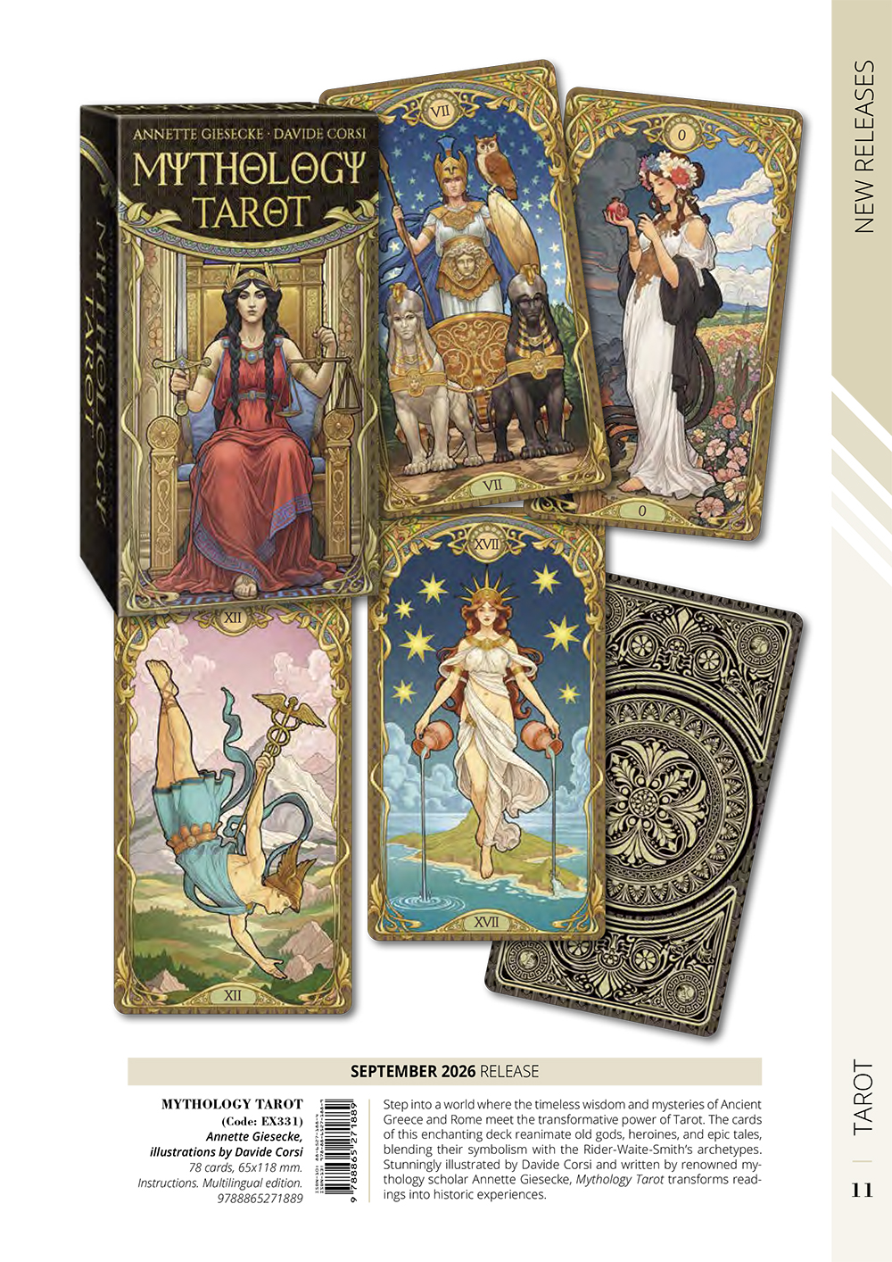 走入古希臘與古羅馬的神話世界,在這裡,跨越時空的智慧與神祕力量與塔羅的轉化力量相遇。這副迷人的牌組喚醒古老的神祇、女英雄與史詩傳說,將它們的象徵意涵融入萊德偉特史密斯(Rider-Waite-Smith)塔羅的原型之中。並搭配新藝術(Art Nouveau)風格的華麗邊框,精心繪製出細膩的線條與裝飾感,讓人物的魅力更加生動、優雅。隨附知名神話學者撰寫的詳盡解說,使每一次占卜不僅是牌義解讀,更如同穿越歷史的藝術旅程,感受角色的智慧與魔力。