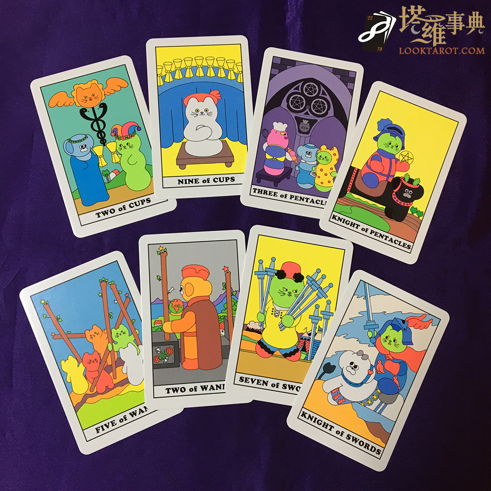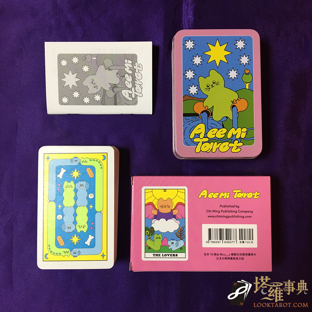 而傳說中貓是一種液體,在這套A ee mi Tarot當中,可以看到其柔軟充滿彈性的一面。有時看起來像一條麵包、一隻毛蟲,轉眼間又恢復成我們人類最傲嬌的室友,演譯起偉特塔羅牌的78張角色,透過大膽搶眼的色彩,讓古老的塔羅牌有了新生命,注入愜意明亮氣息,帶來更多活潑的歡笑情感,是一片在我們兒時回憶裡的想望天地。